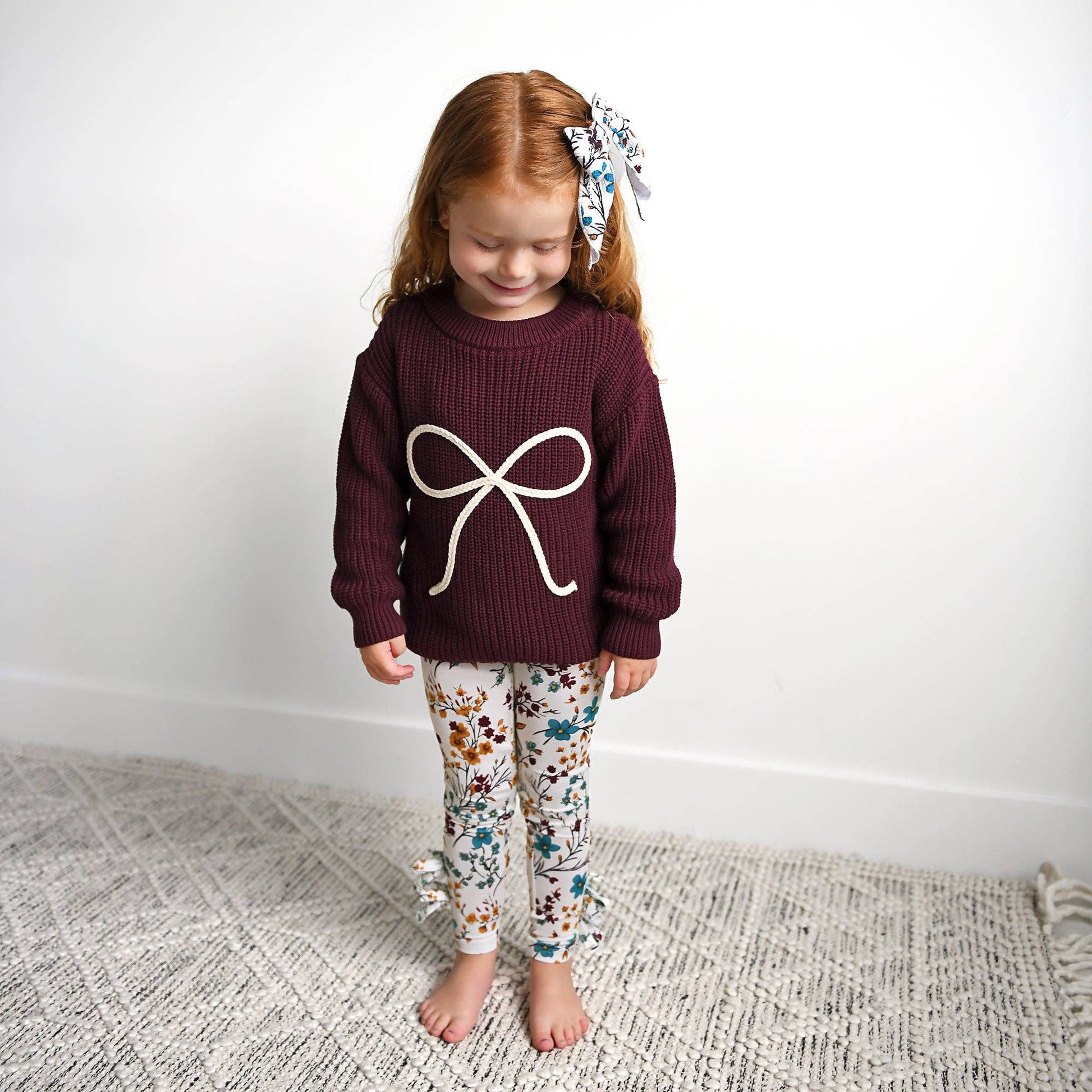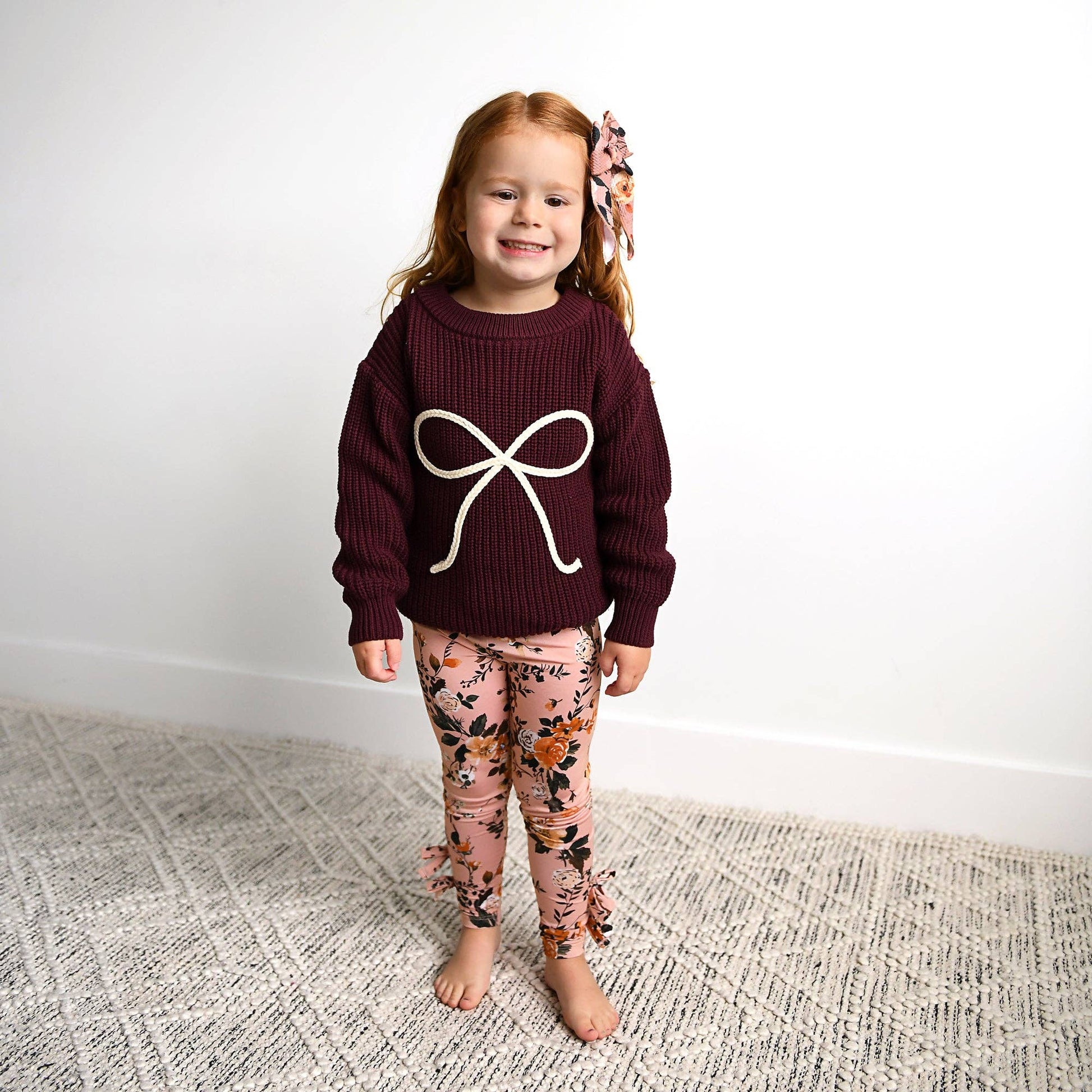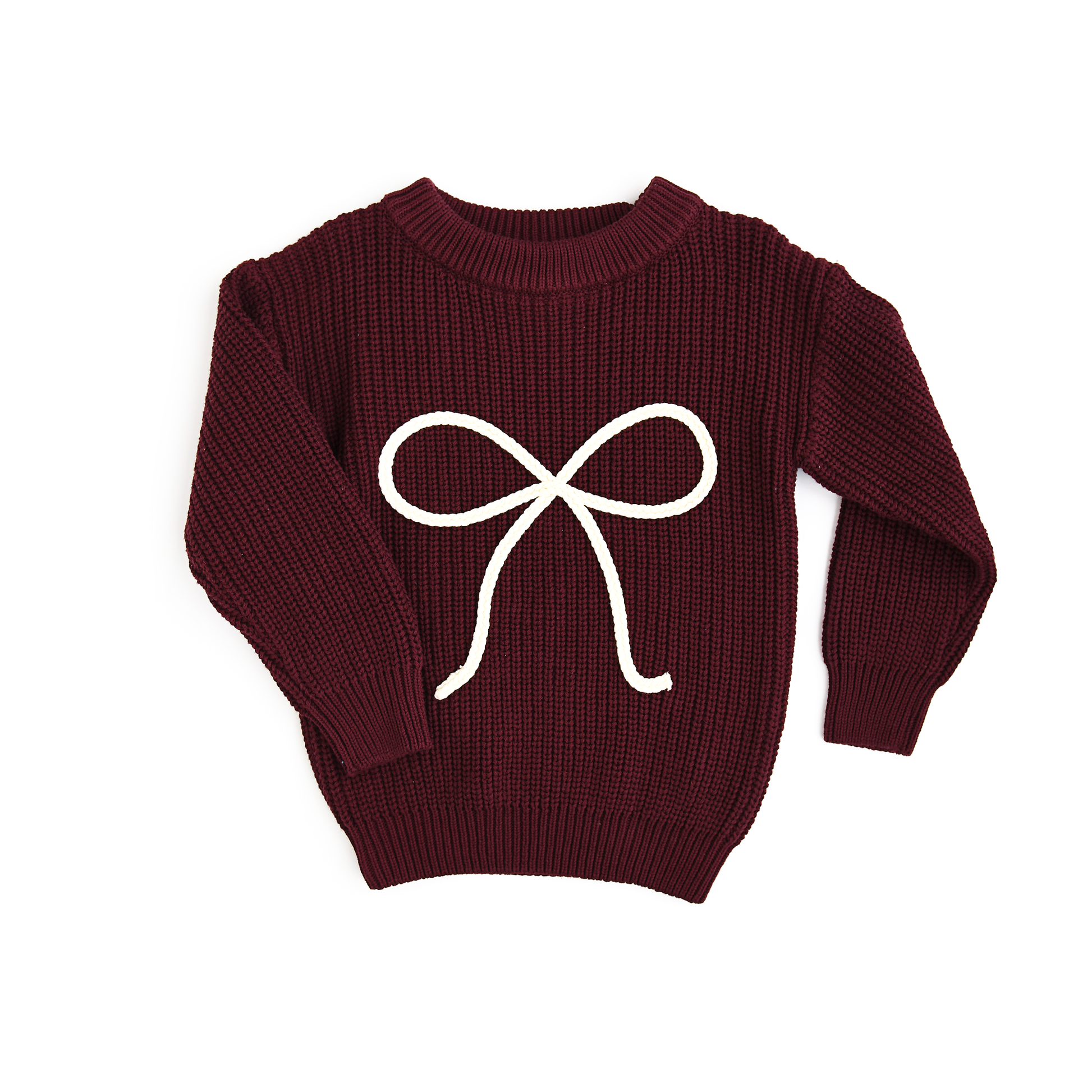 Elevate her winter wardrobe with this stunning maroon chunky knit sweater featuring a hand-stitched cream rope bow. Perfectly blending boutique charm with cozy warmth, it’s the ultimate statement piece for holiday photos and chilly adventures.